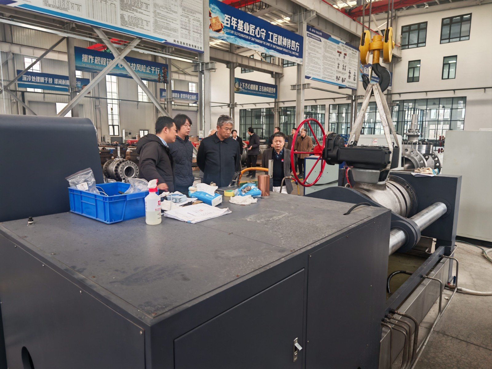 谢正泽董事长陪同日本九门制作所株式会社一行深入到生产车间进行了参观考察,深入公司各生产车间机加工、球体加工、喷涂、研磨、装配、试压、最终检验、涂装发货等主要工序过程以及加工制造过程中的半成品和生产完成的阀门成品存放区进行了参观。期间双方还举行了研讨会。会议上,谢正泽董事长详细介绍了AFA公司安全生产、经营管理、技术研发和市场推广等相关情况。公司宽阔的厂房、精良的装备、精细的管理以及员工丰富的专业知识和有素的工作能力,给客人留下了深刻良好的印象。来访客人对AFA公司产品结构、技术水平、市场定位和现场管理等给予了高度评价。